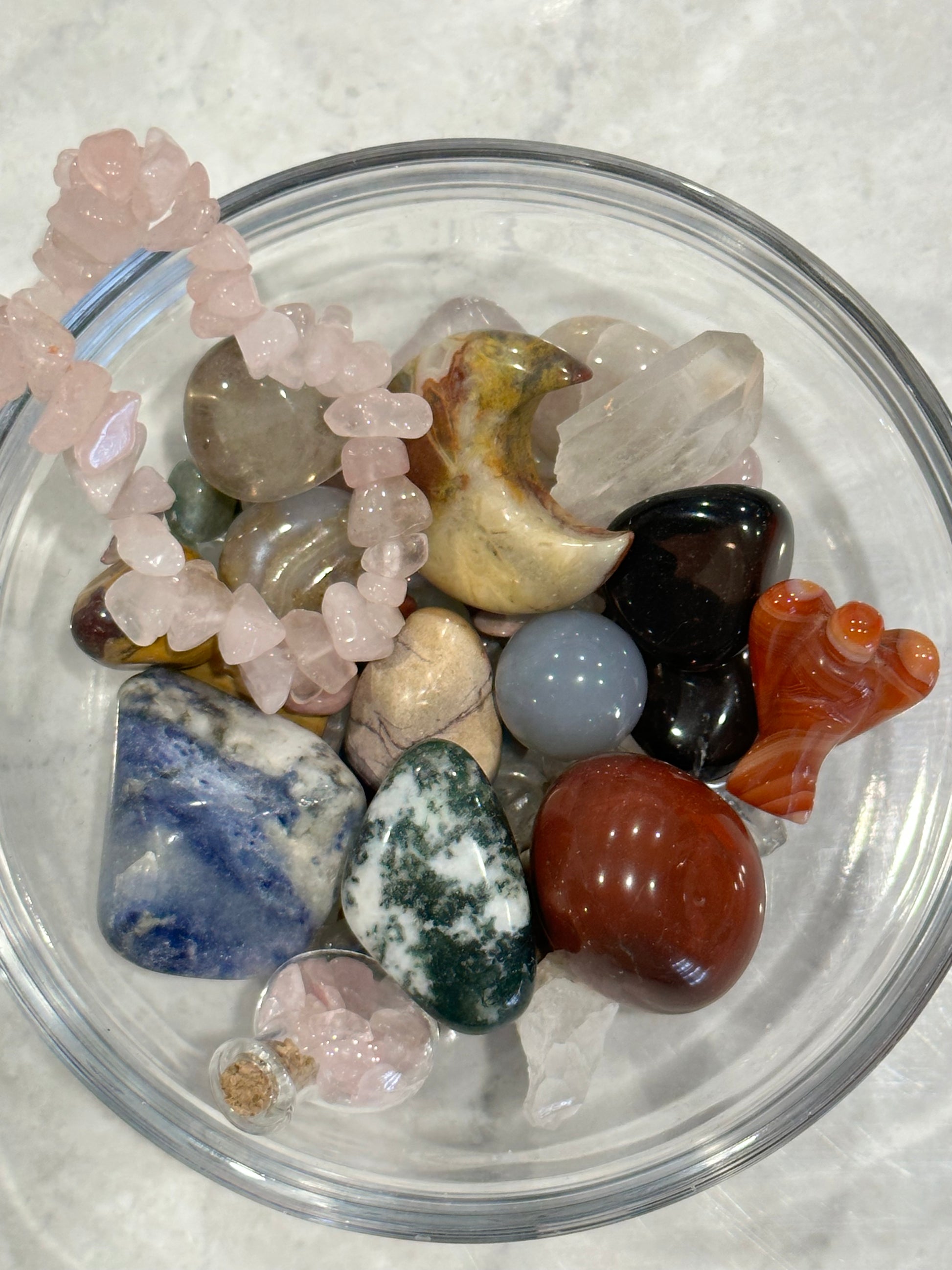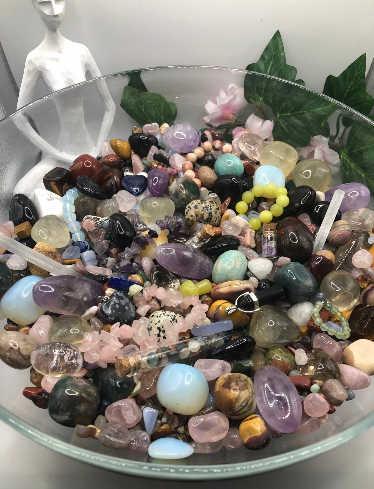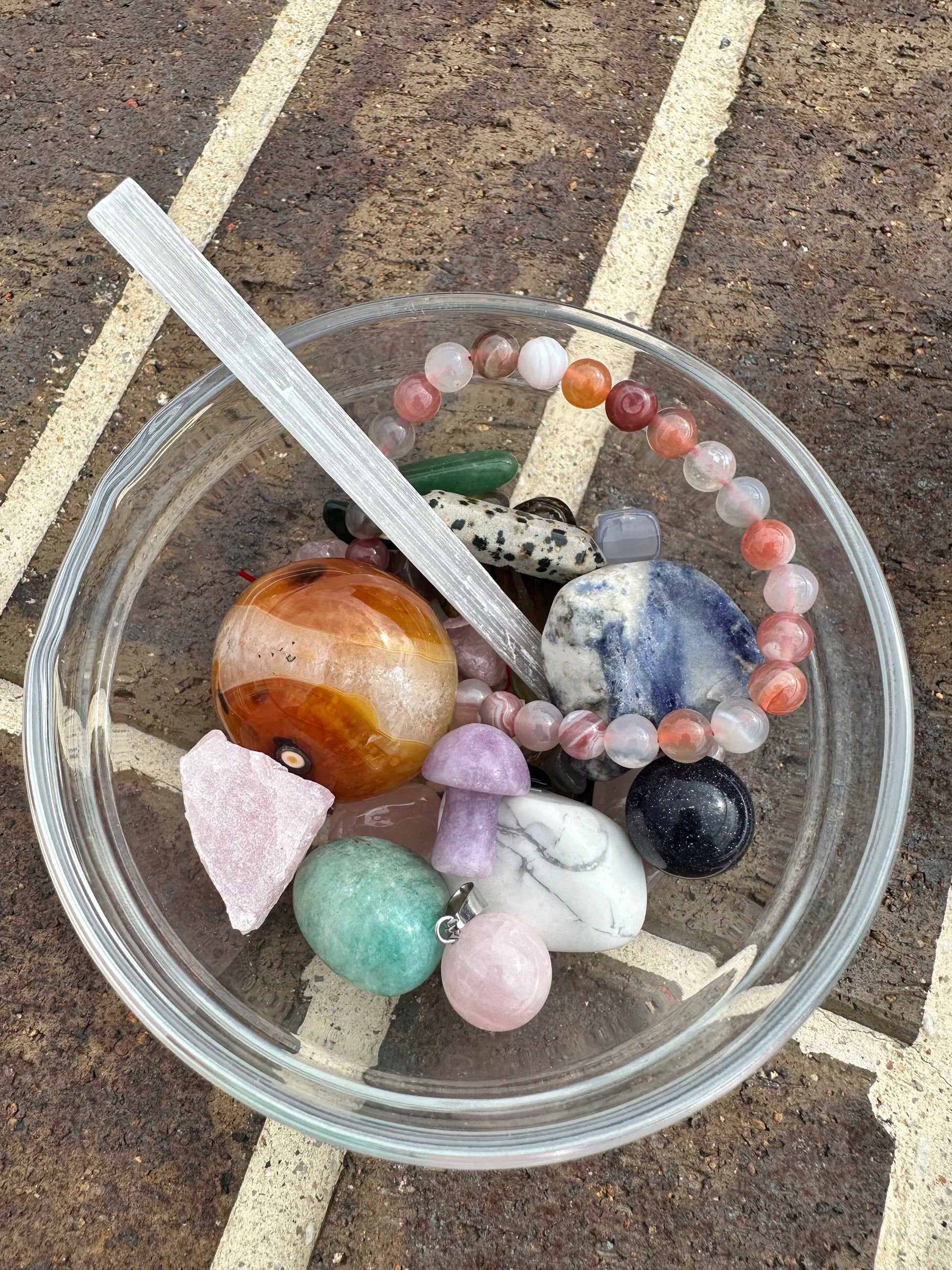 80ml Crystal Confetti Lucky Scoop. Each scoop may include tumbles, crystal chips, DT, beaded bracelet, mini mushroom, mini carving, key ring, geode, pendant, beaded ring, crystal chip bracelet, dress ring, selenite stick or crystal chip bottle.