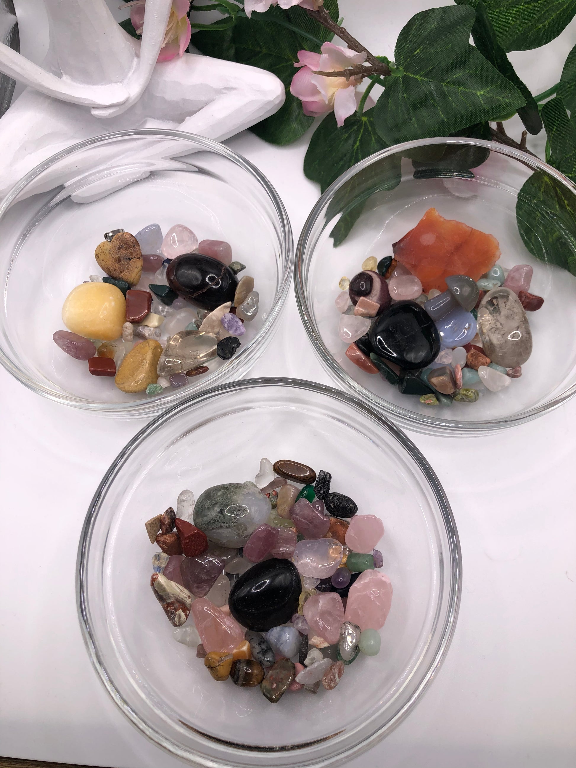 30ml Crystal Confetti Lucky Scoop. Each scoop may include tumbles, crystal chips, DT, beaded bracelet, mini mushroom, mini carving, key ring, geode, pendant, beaded ring, crystal chip bracelet, dress ring, selenite stick or crystal chip bottle.