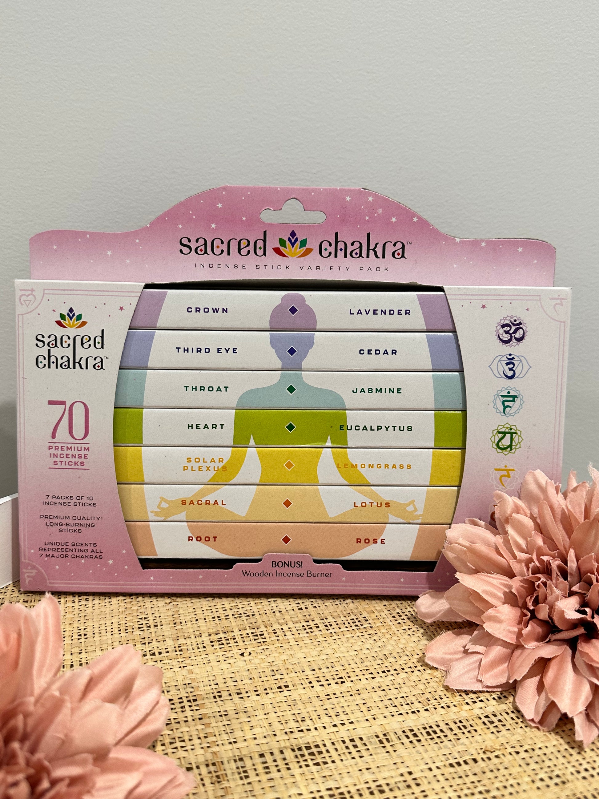 Sacred chakra incense pack. Includes 7 packs of incense (10 incense sticks in each pack). Includes wooden incense burner.
