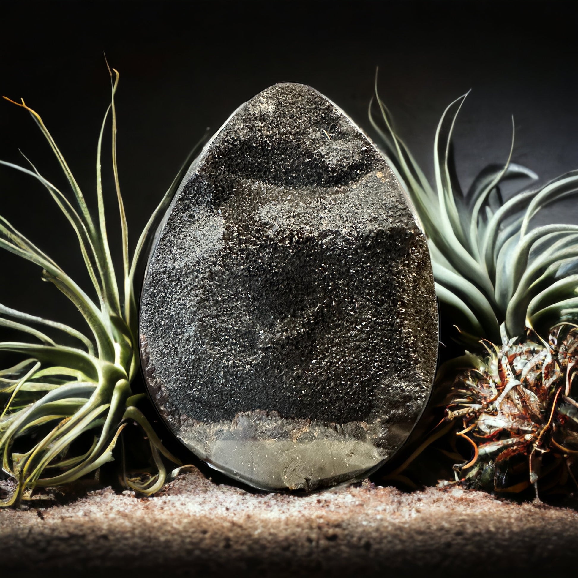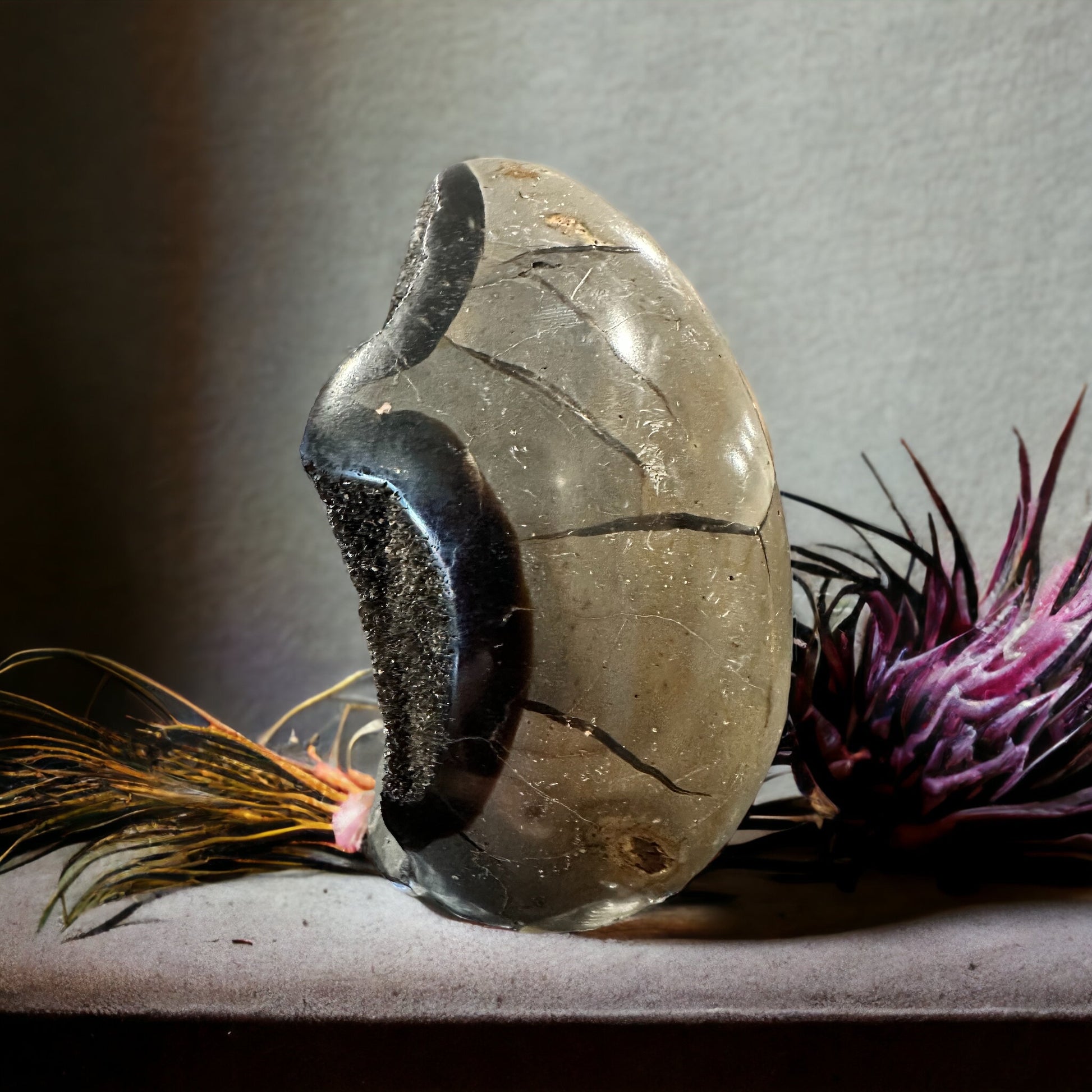Septarian crystal egg. Silky black druzy.