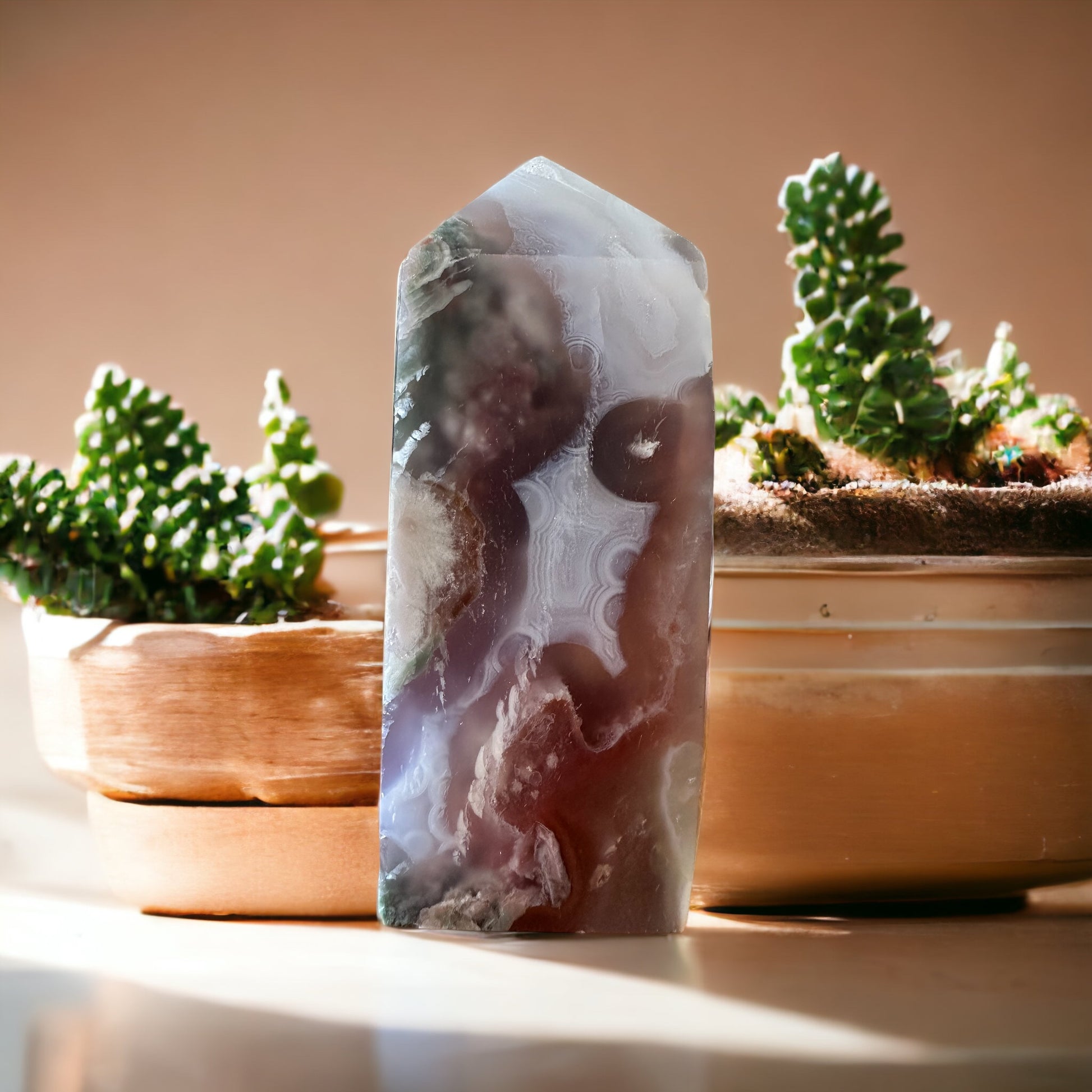 This chunky tower is absolutely gorgeous with large flowers, translucency and banding. The tip has a small sparkling druzy.